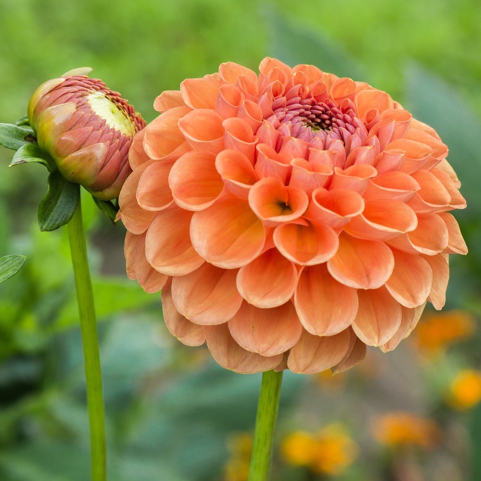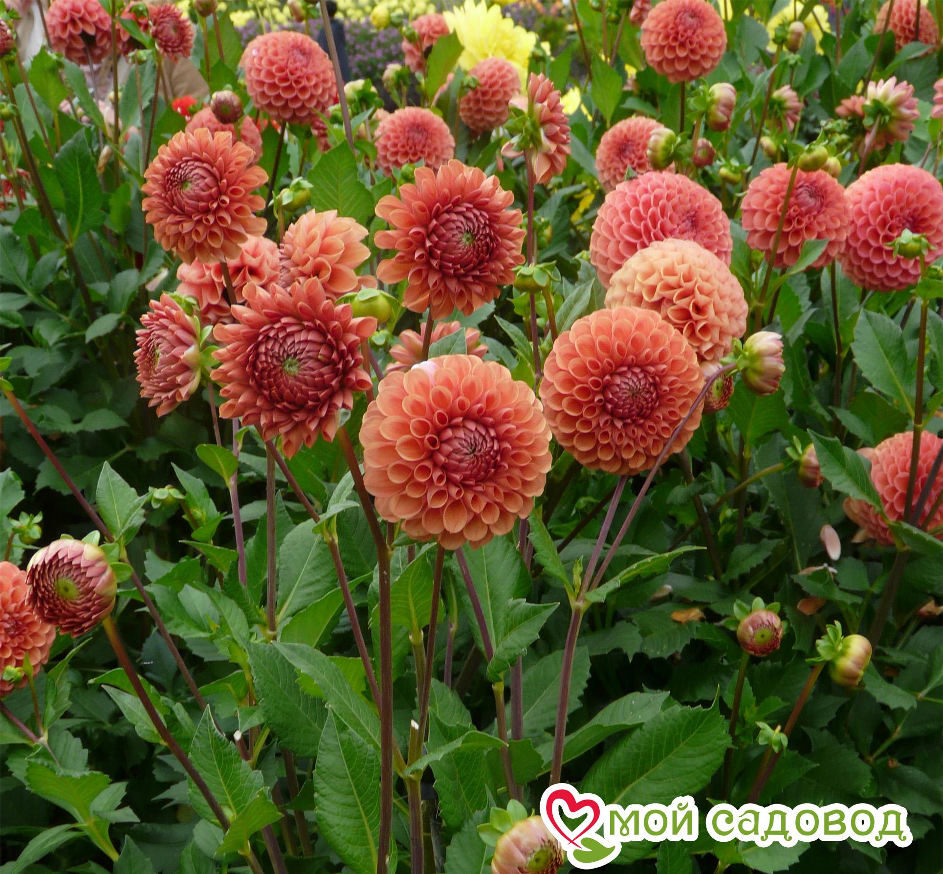 Георгина относится к семейству астровых. Ее цветки имеют пышную форму с многочисленными лепестками, напоминающими розы или пионы. Размеры цветков могут варьироваться, и в среднем достигают 8 – 20 см в диаметре. Лепестки со скругленными или тупыми кончиками. Корзинки полумахровые или немахровые. Окрас пастельный, персиково-оранжевый. Куст сам по себе достаточно компактный (высоты около 40 – 120 см).